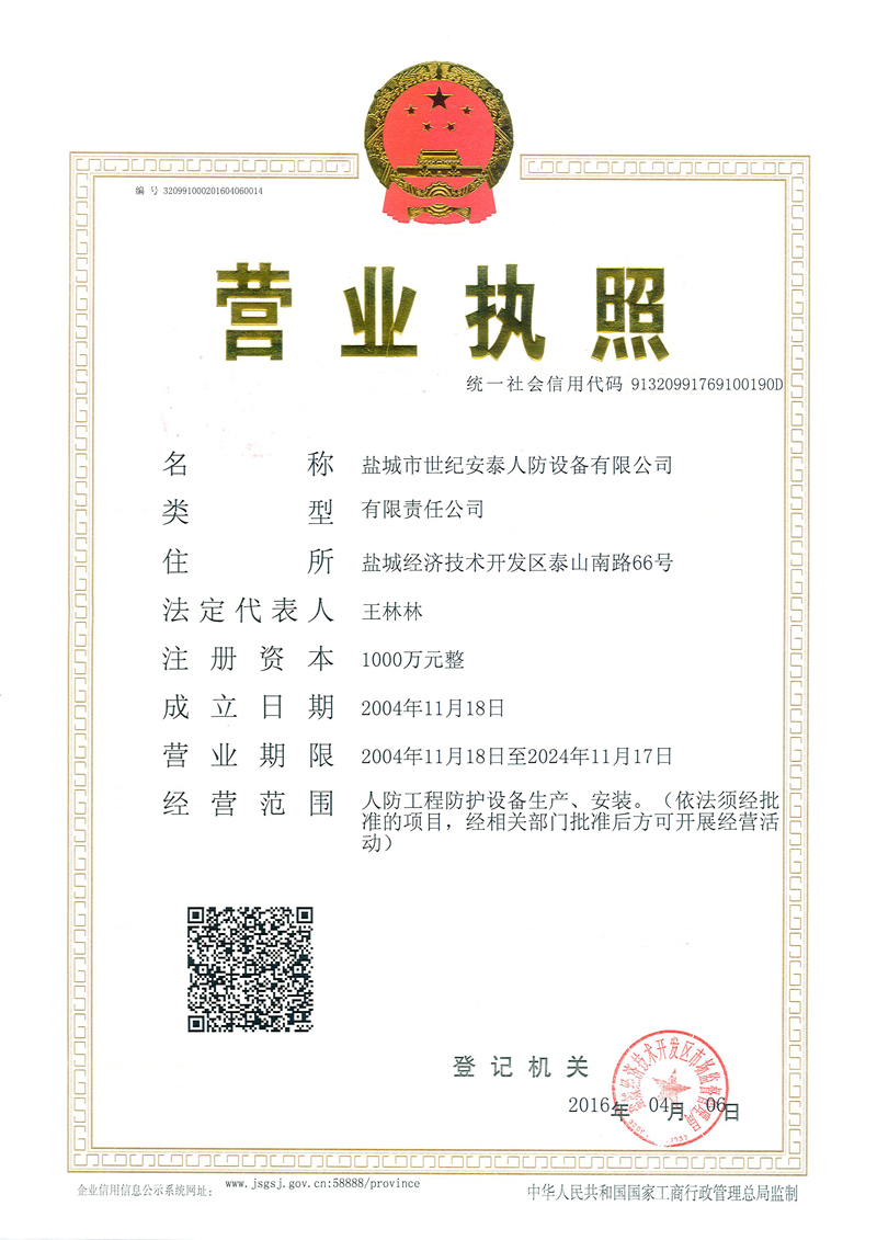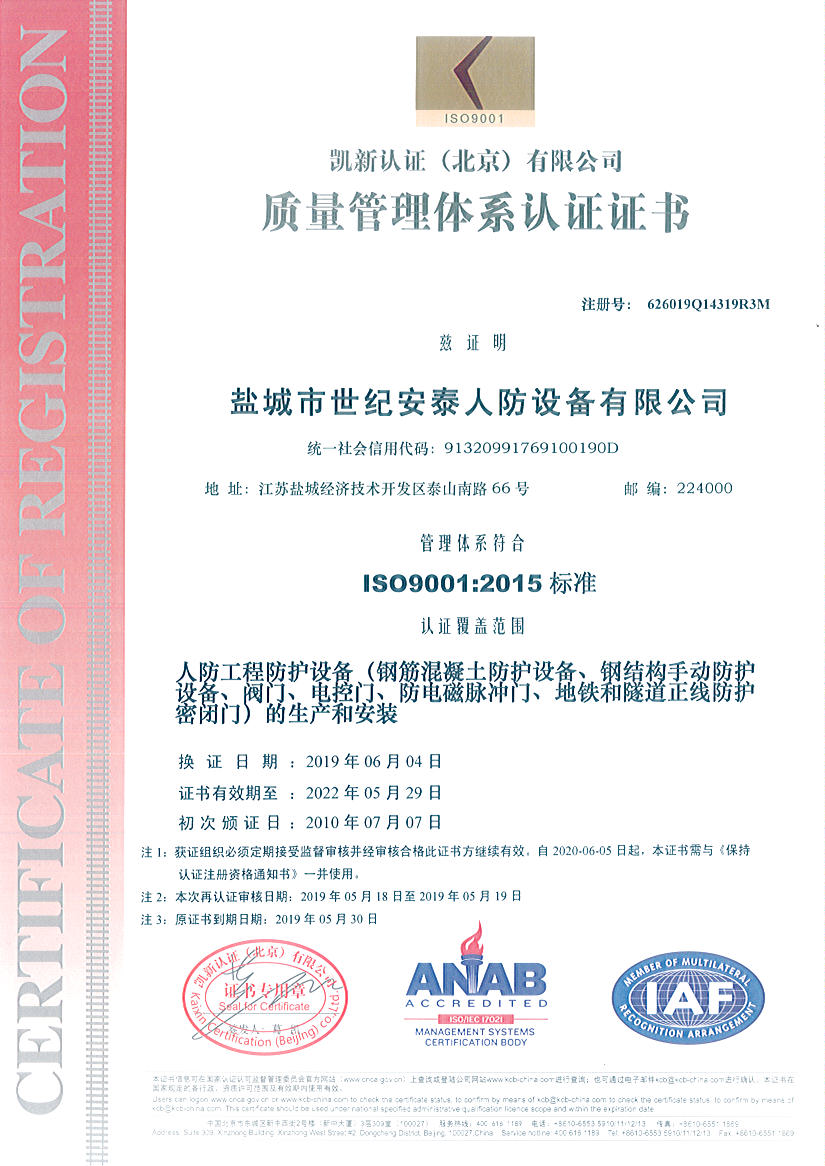 鹽城市世紀(jì)安泰人防設(shè)備有限公司是國家人民防空辦公室批準(zhǔn)成立的人防工程防護(hù)設(shè)備定點生產(chǎn)和安裝企業(yè),是專業(yè)生產(chǎn)、銷售、安裝人防防護(hù)設(shè)備產(chǎn)品的企業(yè),公司主要生產(chǎn)鋼筋混凝土防護(hù)設(shè)備、鋼結(jié)構(gòu)手動防護(hù)設(shè)備、閥門、電控門、防電磁脈沖門、地鐵和隧道正線防護(hù)密閉門等各類產(chǎn)品并對產(chǎn)品進(jìn)行安裝、調(diào)試、維修及保養(yǎng),公司生產(chǎn)的各種規(guī)格的人防工程產(chǎn)品,均按國家人防總參工程兵四所及中國建筑標(biāo)準(zhǔn)設(shè)計研究院提供的圖紙生產(chǎn),符合各種人防工程設(shè)計要求,是各類地下人防工程選用的理想產(chǎn)品。本公司已通過GB/T19001-2008IDT ISO9001:2008國家質(zhì)量體系認(rèn)證。